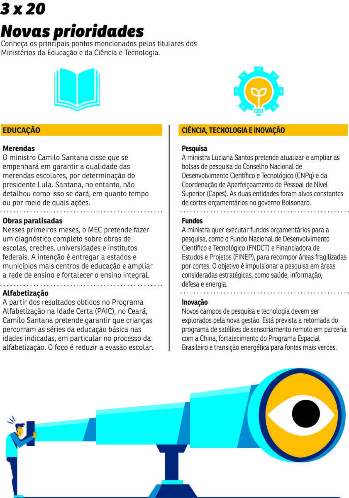 Ao assumirem, respectivamente, os ministérios da Educação e da Ciência e Tecnologia, Camilo Santana e Luciana Santos anunciaram a intenção de reconstruir duas áreas duramente penalizadas no governo de Jair Bolsonaro. Santana afirmou que seguirá como objetivo “resgatar a educação”, enquanto Luciana Santos se propôs a “tratar ciência como política de Estado”.